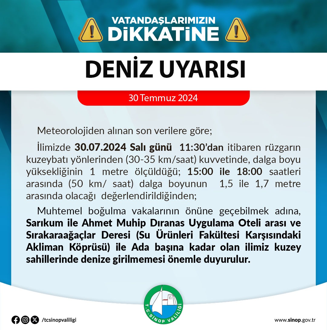 Sinop Valiliğinden yapılan açıklamada ise, “Muhtemel boğulma vakalarının önüne geçebilmek adına, Sarıkum ile Ahmet Muhip Dıranas Uygulama Oteli arası ve Sırakaraağaçlar Deresi (Su Ürünleri Fakültesi Karşısındaki Akliman Köprüsü) ile Ada başına kadar olan ilimiz kuzey sahillerinde denize girilmemesi önemle duyurulur” uyarısı yapıldı.