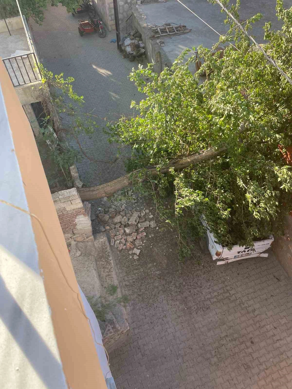Diyarbakır'ın Çermik ilçesinde fırtınada yerinden sökülen ağaç, bir kamyonetin üstüne devrildi.