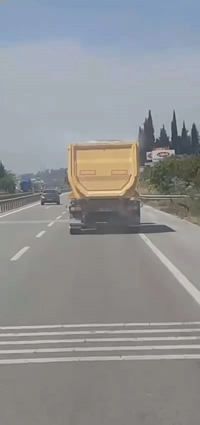 Bursa'da kamyon sürücüsü, dorsesine yüklediği kumların üzerine branda çekmeyince kumlar yola döküldü. İzmir yolunda son sürat giden sürücü, rüzgarın etkisiyle yola dökülen kumları görmezden gelirken, trafiği de tehlikeye attı. O anlar ise kameraya yansıdı