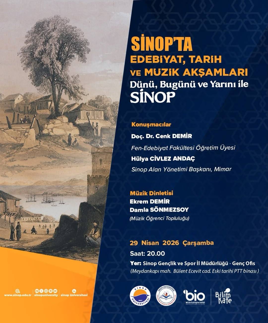 Etkinlik, 29 Nisan 2026 Çarşamba günü saat 20.00’de Sinop Gençlik ve Spor İl Müdürlüğü Genç Ofis’te yapılacak. Programda konuşmacı olarak Fen-Edebiyat Fakültesi öğretim üyesi Doç. Dr. Cenk Demir ile Sinop Alan Yönetimi Başkanı ve mimar Hülya Civlez Andaç yer alacak. Katılımcılar, Sinop’un tarihsel gelişimi, kültürel mirası ve geleceğine dair değerlendirmeleri dinleme fırsatı bulacak.