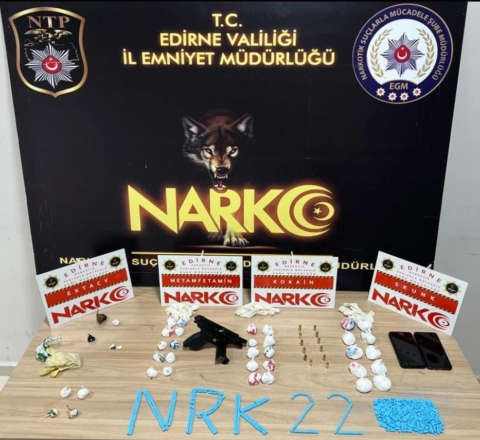 Edirne'de yapılan uyuşturucu operasyonunda 402 gram metamfetamin, satışa hazır halde 35 fişek, 400 adet ecstasy hap, 1 fişek halinde kokain, 1 fişek plaka esrar, 1 fişek skunk, 1 adet ruhsatsız 9.19 mm tabanca, 12 adet 9.19 mm tabanca fişeği ele geçirilirken, 2 şüpheli ise gözaltına alındı.
