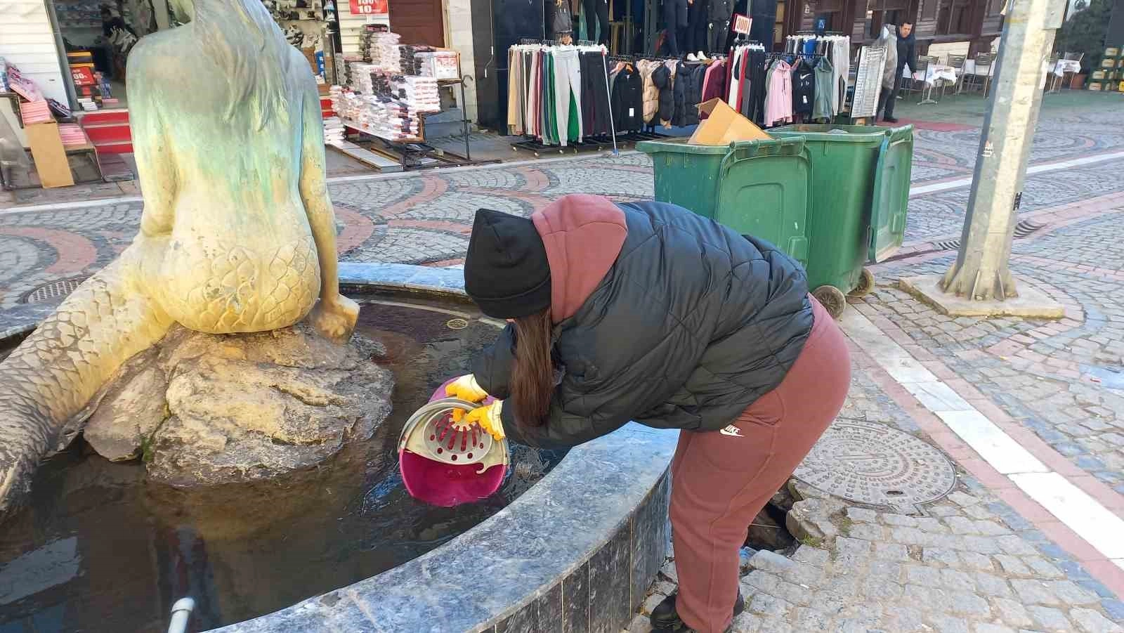 Edirne yaşayan vatandaşlardan Tehmine Alieva, "Sabah dükkânda bulunan sular donmuş, dükkânımızı açmaya geldik. Havada çok soğuk. Biraz su ihtiyacımız olduğu için havuzdan almaya çalıştık ama havuzda donmuş. Buzu kırarak biraz su almaya çalışacağım" dedi.