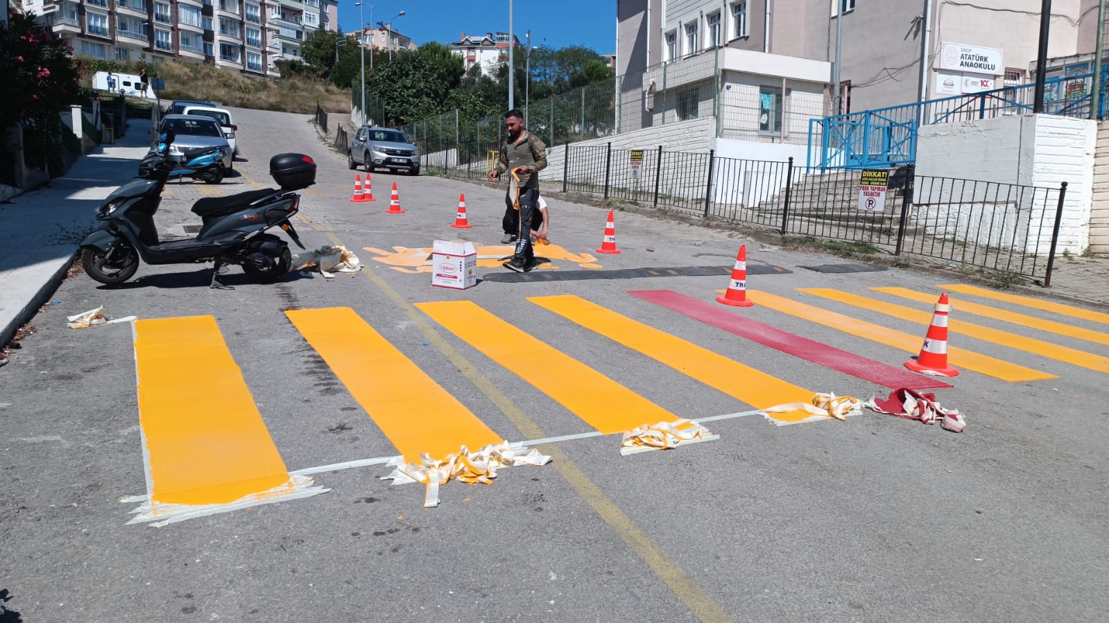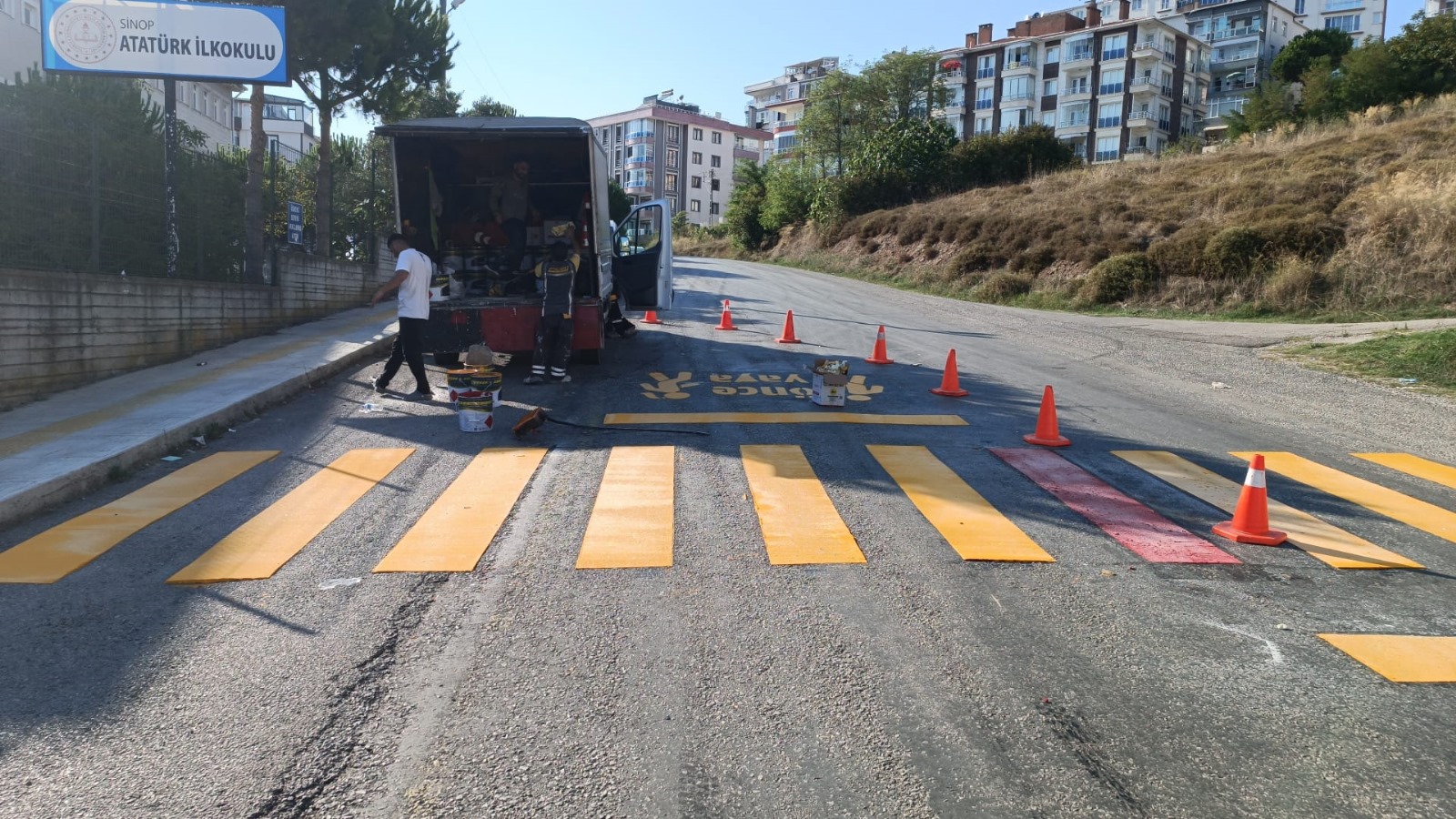 Sinop Belediyesi Fen İşleri Müdürlüğü’ne bağlı ekipler, il genelinde okul çevreleri ve kent merkezinde yaya güvenliğini, sağlıklı trafik akışını sağlayan yaya geçitlerinin boyalarını yeniliyor. Silinmiş ve görünürlüğünü kaybetmiş mevcut çizgiler yeniden boyanıyor. Yaya geçit çizgisi olmayan noktalarda da planlama doğrultusunda yeni çizgiler çiziliyor. Yapılan çalışma ile trafikte yaya ve sürücüler açısından büyük önem taşıyan yaya geçitleri, daha görünür hale getirilerek, araç ve yaya trafiğinin daha sağlıklı işlemesi ve oluşabilecek kazaların önüne geçilmesi amaçlanıyor.
