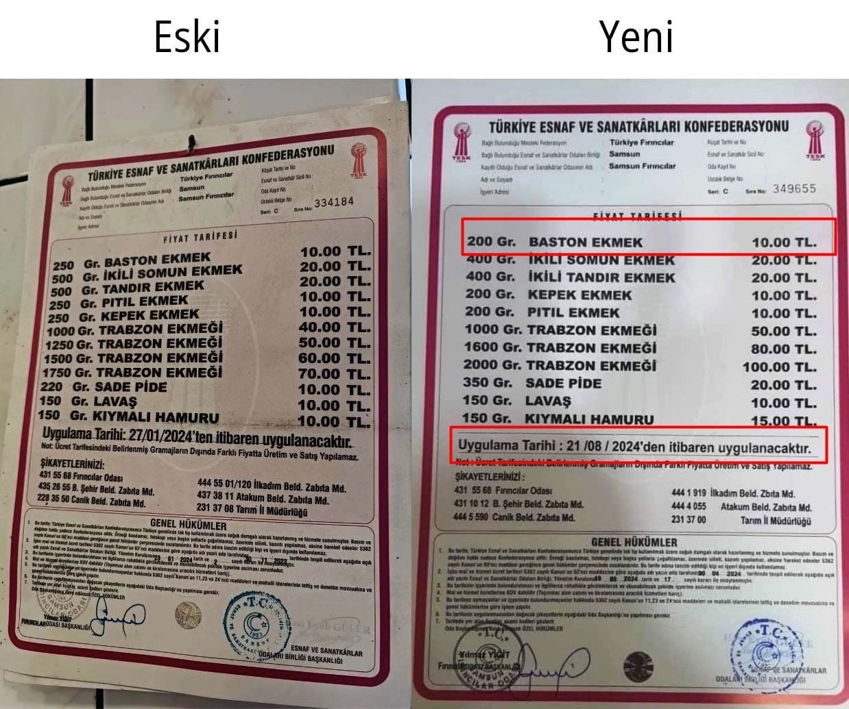 Esnaf ve Sanatkarlar Odaları Birliği Başkanlığı (SESOB) ve Samsun Fırıncılar Odası'nın kararı ile Samsun'da uygulanan ekmek fiyat tarifesi değişti. 21 Ağustos'ta yürürlüğe girecek yeni tarifeyle 250 gramı 10 TL'den satılan ekmeğe 'gizli zam' uygulanarak 200 gramı 10 TL'den satışa sunulacak. Vatandaşlar, ekmeğe uygulanan zamma tepki göstererek artık günde 1-2 ekmek daha fazla almak zorunda kalacaklarını söyledi.