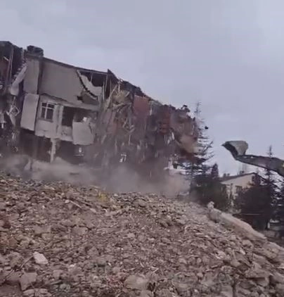 Elazığ'da 6 Şubat 2023'te Kahramanmaraş merkezli depremlerde ağır hasar gören binaların yıkımı devam ediyor. Merkez Sürsürü Mahallesi'nde ağır hasarlı 4 katlı binanın çevre güvenliğinin alınmasının ardından yıkımına başlandı. Binanın yıkımı sırasında iş makinelerinin yanı sıra ses dalgalarından da faydalanıldı. Binanın belirli noktalarına korna sesiyle destek verildi. İş makinelerinin müdahalesi ve ses dalgalarının etkisiyle 4 katlı bina yıkıldı.