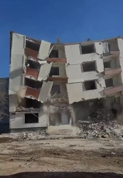 Kahramanmaraş'ta 6 Şubat 2023'te meydana gelen yıkıcı depremlerden etkilenen iller arasından bulunan Elazığ'da ağır hasarlı binaların yıkımı devam ediyor. Bu çerçevede, Sürsürü Mahallesi'nde yıkımına başlanan 5 katlı bina, iş makinesinin makasını vurmasıyla bir anda yerle bir oldu. O anlar ise cep telefonu kamerası ile kaydedildi.