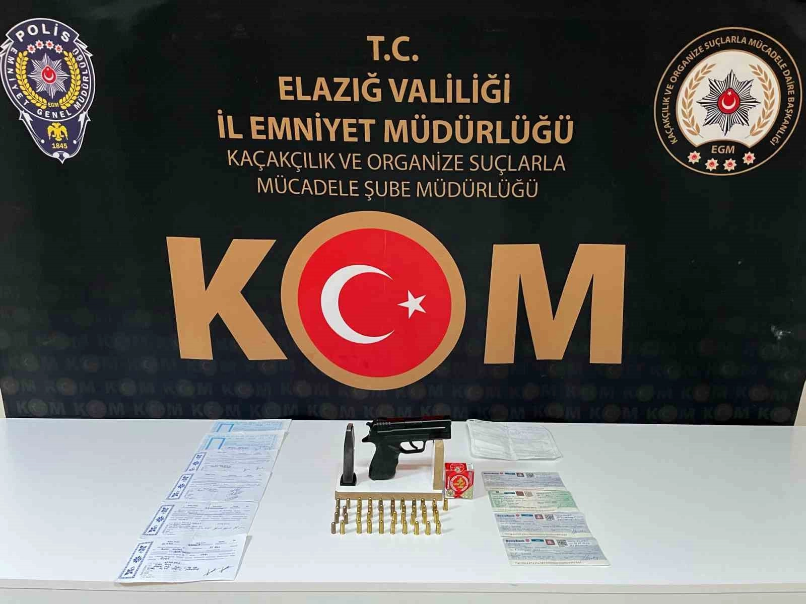 Elazığ Cumhuriyet Başsavcılığı koordinesinde İl Emniyet Müdürlüğü Kaçakçılık ve Organize Suçlarla Mücadele Şube Müdürlüğü tarafından tefecilik, gasp, kasten yaralama, hakaret suçları ile ilgili çalışma gerçekleştirdi. Yürütülen soruşturma kapsamında ekonomik durumu kötü olan vatandaşlara yüksek faizle borç para verdikleri, borç verdikleri paraya karşılık senet aldıkları, borcunu ödemeyen şahısların mal varlıklarına tedbir koydurdukları ve vatandaşları gasp ettiği değerlendirilen 2 şüpheli şahıs, 20 Martta düzenlenen eş zamanlı operasyonda yakalanarak gözaltına alındı. Yapılan aramada, çok sayıda çek, senet ve dijital materyal, 1 adet ruhsatsız tabanca ve tabancaya ait 29 adet fişek ele geçirildi.