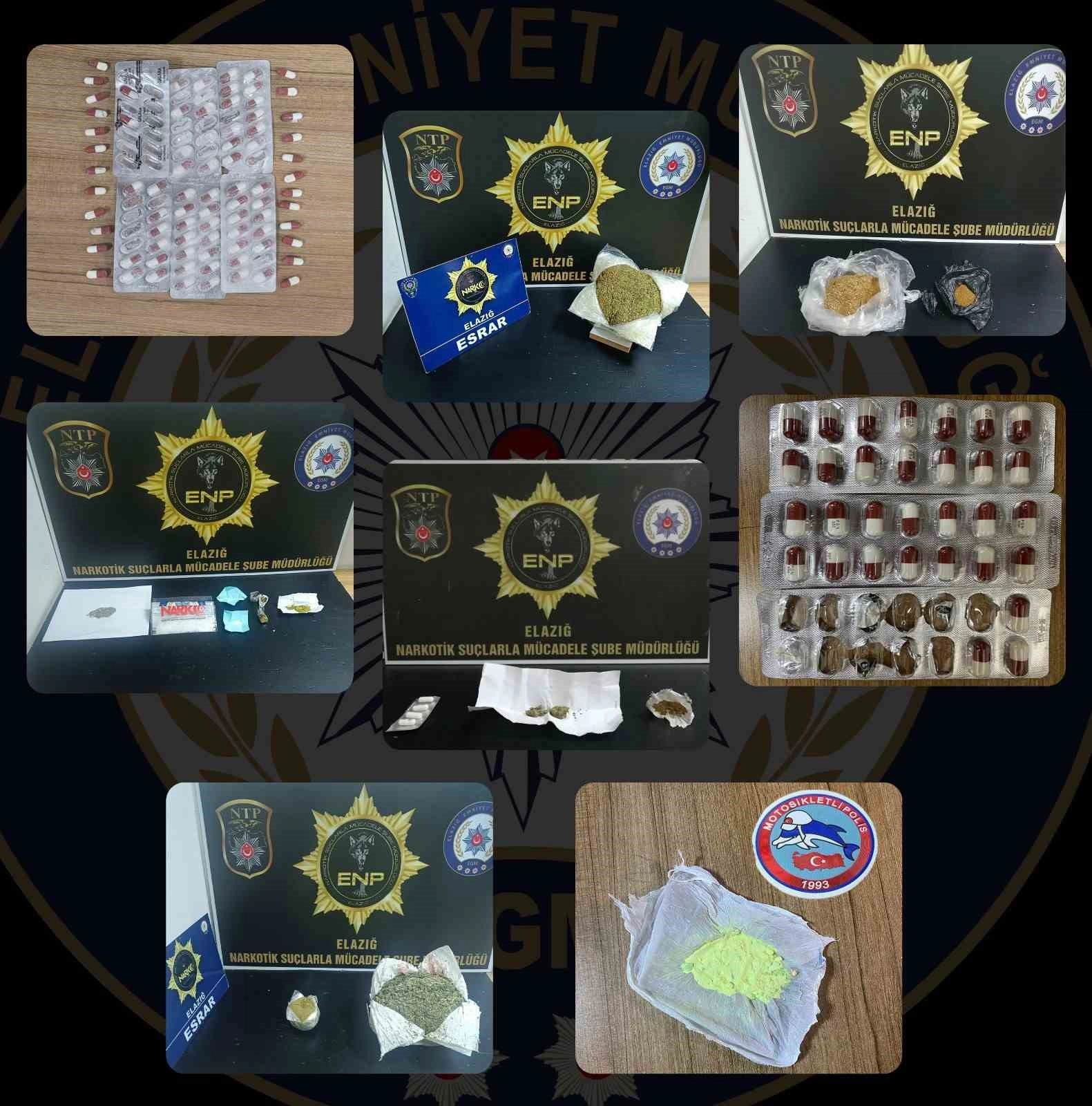 Elazığ Cumhuriyet Başsavcılığı koordinesinde İl Emniyet Müdürlüğü Narkotik Suçlarla Mücadele Şube Müdürlüğü tarafından, uyuşturucu ile mücadele kapsamında uyuşturucu madde kullanan şahıslara ve sokak satıcılarına yönelik çalışma yapıldı. Yapılan çalışmada, 10 parça halinde 1 kilo 990,16 gram esrar maddesi, 5 parça halinde 45,44 gram metamfetamin maddesi, 2 parça halinde 116,33 gram sentetik kannabinoid maddesi, 115 adet sentetik ecza ve 10 gram extacy ele geçirildi.