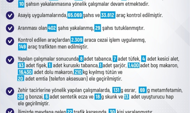 Yapılan çalışmalar sonucunda 8 adet tabanca, 7 adet tüfek, 4 adet kesici alet, 93 adet fişek, 1 adet kurusıkı tabanca, 1 adet şarjör, bin 400 adet boş makaron, 16 bin 430 adet dolu makaron, 210 kilo kıyılmış tütün ve 20 adet telefon aksesuarı ele geçirildi. Zehir tacirlerine yönelik yapılan çalışmalarda, 131 gram esrar, 69 gram metamfetamin, 20 gram bonzai, 6 adet sentetik ecza ve 18 gram skunk ve 13 adet uyuşturucu hap ele geçirildiği bildirildi.