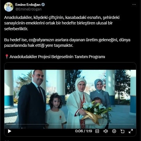 Emine Erdoğan, himayesinde, Sanayi ve Teknoloji Bakanlığınca yürütülen Anadoludakiler Projesi'nin, dün Cumhurbaşkanlığı Millet Kütüphanesi'nde düzenlenen belgesel tanıtım programına ilişkin sosyal medya hesabından paylaşımda bulundu.