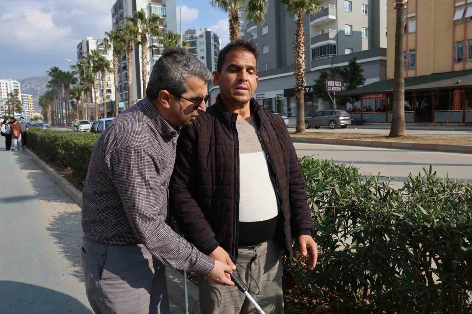 Adana'da doğuştan görme engelli Ahmet Ünal, 2 yıl önce görme yetisini yitiren Adem Kılınç'a beyaz baston eğitimi vererek sokakta yürümesini sağladı.
