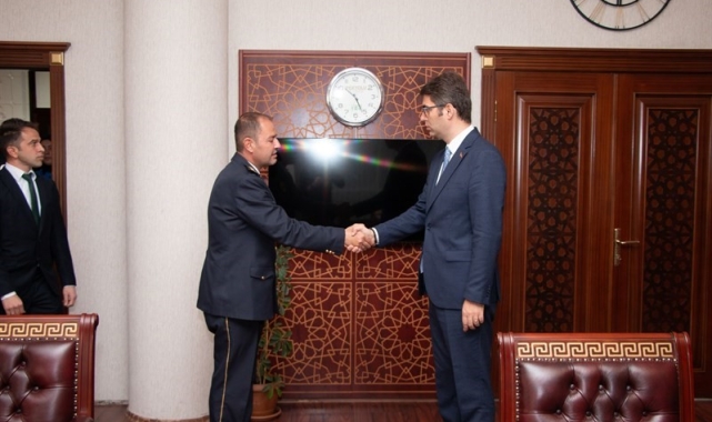 İlçe Emniyet Müdürü Trak, ziyaretin anısına Kaymakam Karaloğlu'na çiçek takdim etti.