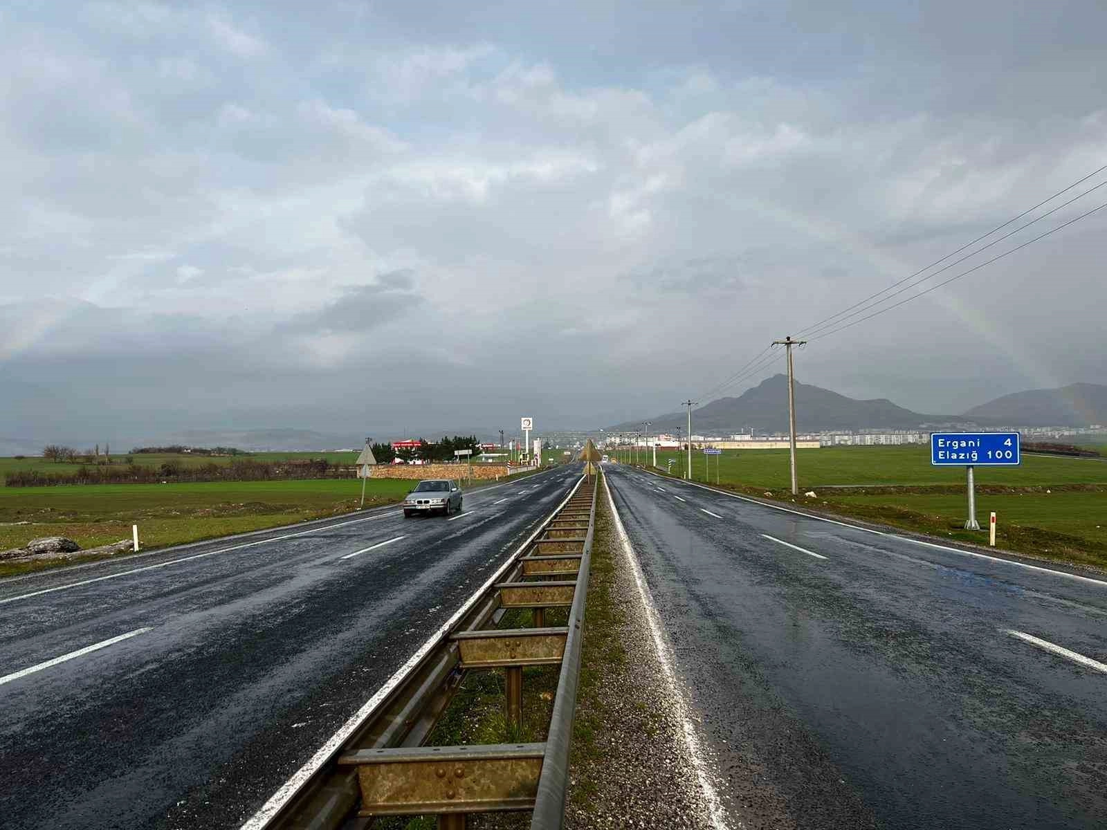 Ergani ilçesinde sabah saatlerinde yağmur etkili oldu. Yağmur sonrası ilçeye 4 kilometre kala ortaya çıkan gökkuşağı ise gökyüzünde görsel şölen oluşturdu.