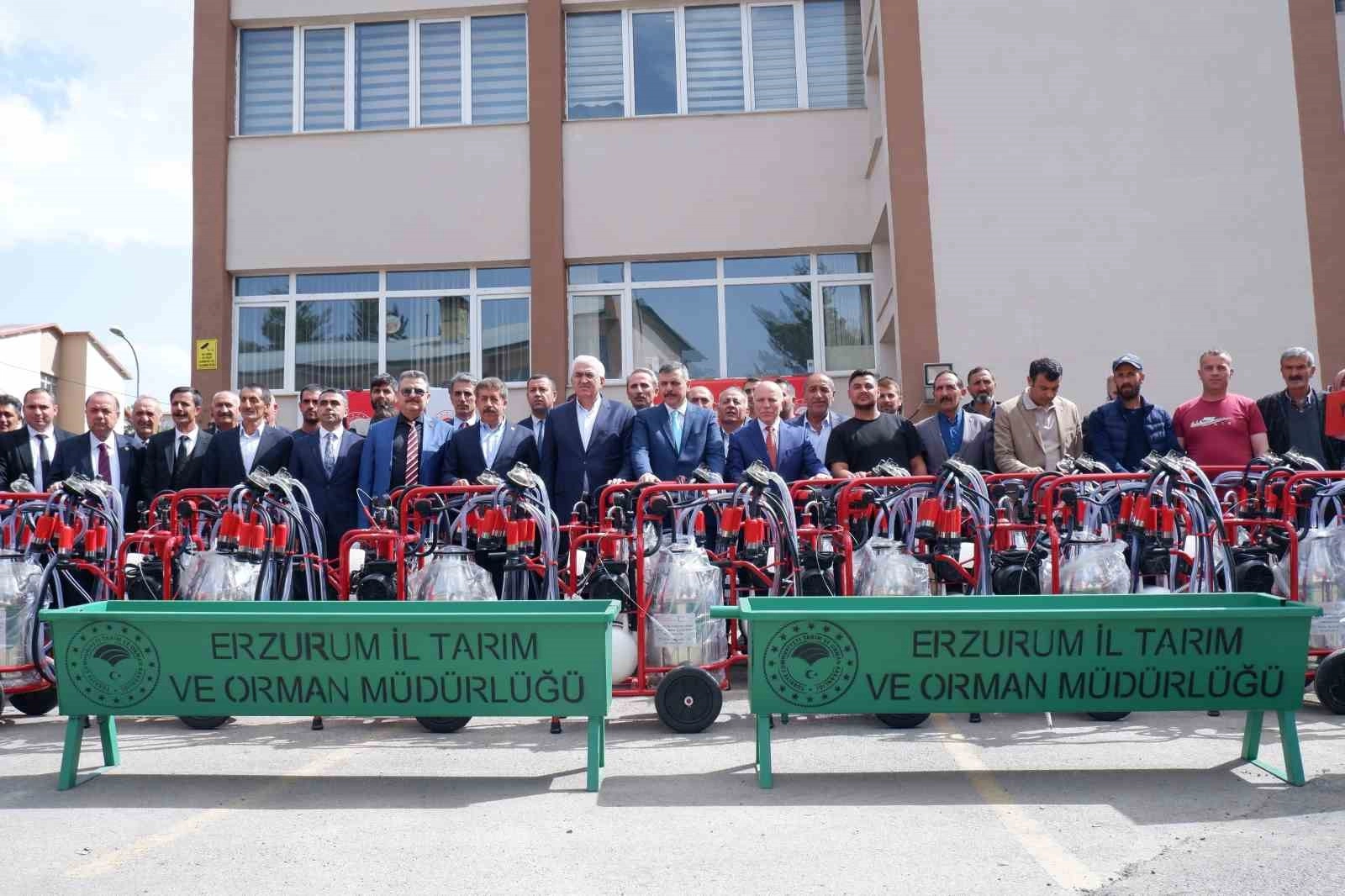 Erzurum'da hayvancılığın geliştirilmesi ve çiftçiye destek olmak için yüzde 75 hibe destekli süt sağım, koyun kırkım ve yem ezme makinesi dağıtıldı.