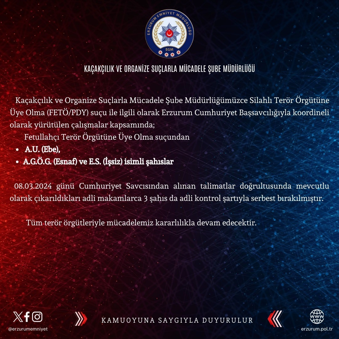 Erzurum Emniyet Müdürlüğü Kaçakçılık ve Organize Suçlarla Mücadele Şube Müdürlüğü ekiplerince Silahlı Terör Örgütüne Üye Olma (FETÖ/PDY) suçu ile ilgili olarak Erzurum Cumhuriyet Başsavcılığıyla koordineli olarak yürütülen çalışmalar kapsamında; 3 şüpheli yakalandı.