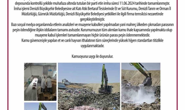 "Kurumumuz tarafından ithal edilen ve mikrobiyolojik analiz sonuçları Salmonella pozitif olan bir parti et 5996 Sayılı Veteriner Hizmetleri, Bitki Sağlığı, Gıda ve Yem Kanunu çerçevesinde 11 Haziran 2024 tarihinde imha edilmiştir. Kamu ihale mevzuatı hükümleri çerçevesinde Kurumumuz tarafından ithal edilen etlerin gıda güvenilirliği kapsamında, yurt içine girişlerinde Bakanlığımız tarafından kontrol muayenesi için numune alınmakta ve akredite laboratuvarda gerekli analizleri yapılmaktadır. 09 Mayıs 2024 tarihinde yapılan mikrobiyolojik analizlerde bir parti ette görülen hijyen standartlarına aykırı sonuçlar nedeniyle satın alma/muayene komisyonunca reddedilen etler, dondurularak yediemin deposunda kontrollü şekilde muhafaza altına alınmış ve yüklenici kesimhane firmasına ihtarname çekilmiştir. Yasal işlemlerin tamamlanmasının ardından yediemin deposunda kontrollü şekilde muhafaza altında tutulan bir parti etin imha süreci 11 Haziran 2024 tarihinde tamamlanmıştır. İmha işlemi Denizli Büyükşehir Belediyesine ait Katı Atık Bertaraf Tesislerinde Et ve Süt Kurumu, Denizli Tarım ve Orman İl Müdürlüğü, Gümrük Müdürlüğü, Denizli Büyükşehir Belediyesi yetkilileri ile ilgili firma temsilcisi nezaretinde gerçekleştirilmiştir. Bazı sosyal medya organlarında etlerin analizleri ve muayene kabulleri yapılmadan yani mahreç ülkeden çıkmadan parasının peşin ödendiğine ilişkin iddiaların tamamı asılsızdır. Kurumumuzun tüm alımları kamu ihale kapsamında yapılmakta olup muayene kabul işlemleri tamamlanmayan hiçbir ürünün parası peşin ödenmemektedir. Kamu güvencesiyle yapılan et ve canlı hayvan ithalatının tüm süreçlerinde yüksek hijyen standartları titizlikle uygulanmaktadır."