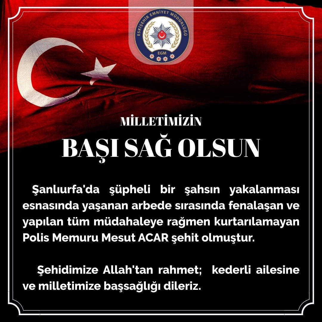 Eskişehir Emniyet Müdürlüğü, Şanlıurfa'da görev sırasında rahatsızlanan şehit olan polis memuru Mesut Acar için taziye mesajı yayımladı.