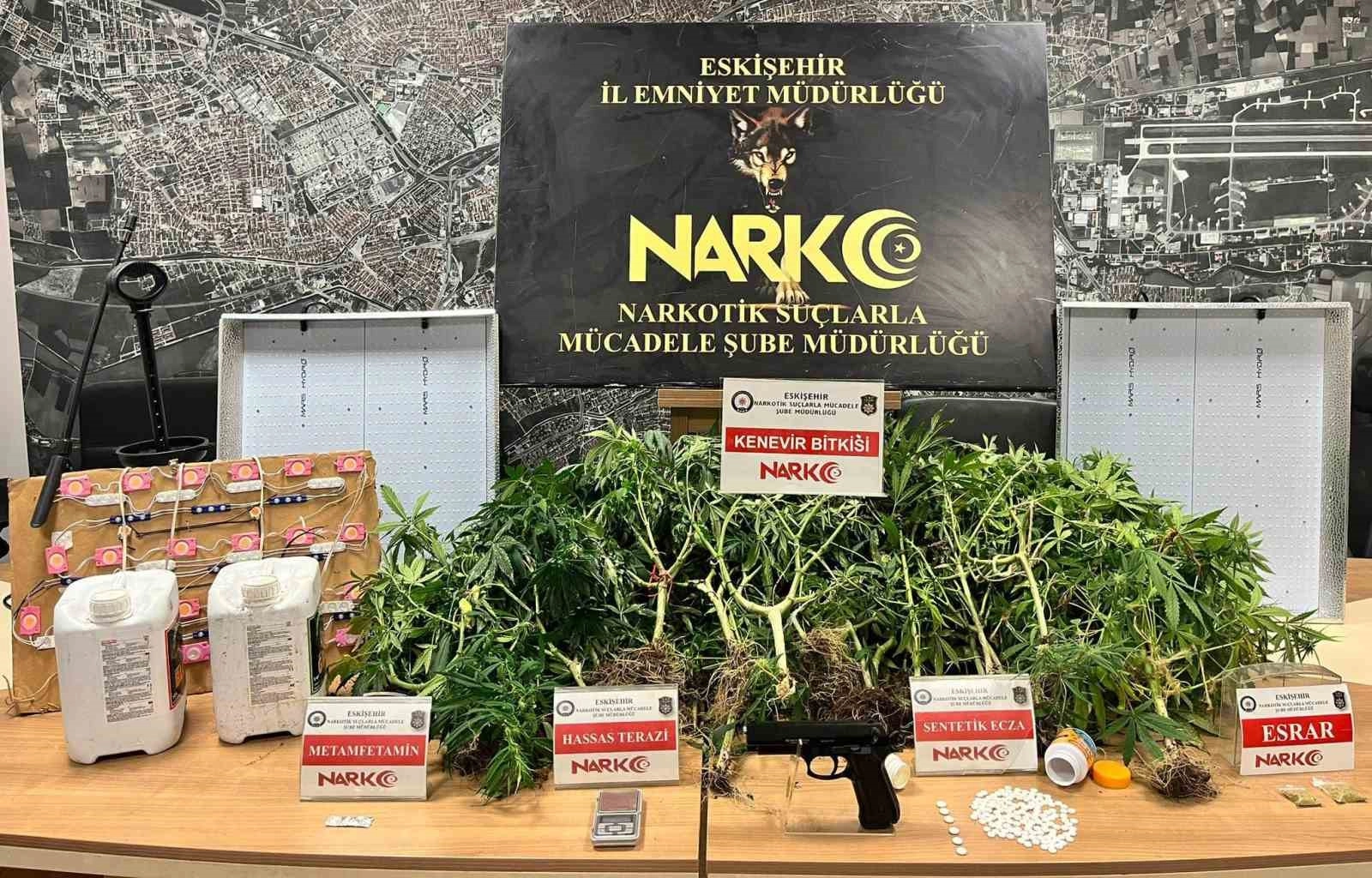 Narkotik Suçlarla Mücadele Şube Müdürlüğü ekiplerince Eskişehir il merkezinde uyuşturucu madde ticaretine yönelik çalışma yapıldı. Edinilen bilgiye göre, yapılan çalışmaları kapsamında 1 şüpheli yakalandı. Şüphelinin ikametinde yapılan aramada; 70 kök Hint keneviri, 141 metadon hap, 13 gram esrar, 6 tramadol hap, 1 gram metamfetamin, 1 hassas terazi, 1 ruhsatsız tabanca, 2 aydınlatma cihazı, 1 ilaçlama pompası, 1 elektrik düzeneği ve 10 litre sıvı gübre ele geçirildi. Hakkında işlem başlatılarak gözaltına alınan şüpheli, çıkarıldığı mahkemece tutuklanarak cezaevine gönderildi.
