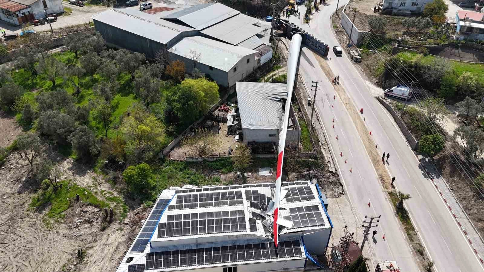 Çanakkale'de devrilen tırın taşıdığı rüzgar gülü kanadının plastik sandık fabrikası üzerine yıkıldığı kaza dronla görüntülendi. Kazada 75 metrelik kanat fabrika ile bir dama zarar verdi.