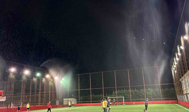 Düzce'de bir halı sahada müşterilerinin hava sıcaklıklarından etkilenmesini istemeyen işletmeci su püskürtme sistemi kurdu.