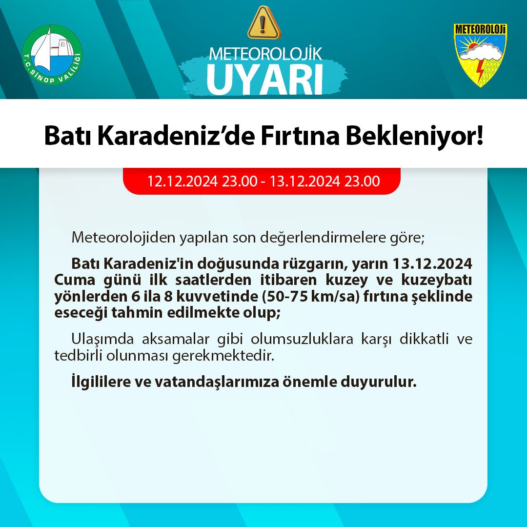 Meteoroloji 10. Bölge Müdürlüğü Bölge Tahmin ve Uyarı Merkezinden yapılan açıklamada “Batı Karadeniz'in doğusunda rüzgarın, yarın 13.12.2024 Cuma günü ilk saatlerden itibaren kuzey ve kuzeybatı yönlerden 6 ila 8 kuvvetinde (50-75 km/sa) fırtına şeklinde eseceği tahmin edilmektedir” denildi.
