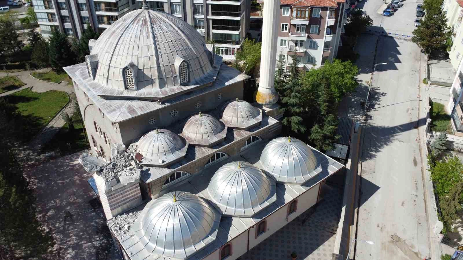 Çankırı'da etkili olan fırtınaya dayanamayan çifte minareli caminin bir minaresi yıkıldı. Tek minaresi kalan cami, dron ile havadan görüntülendi.