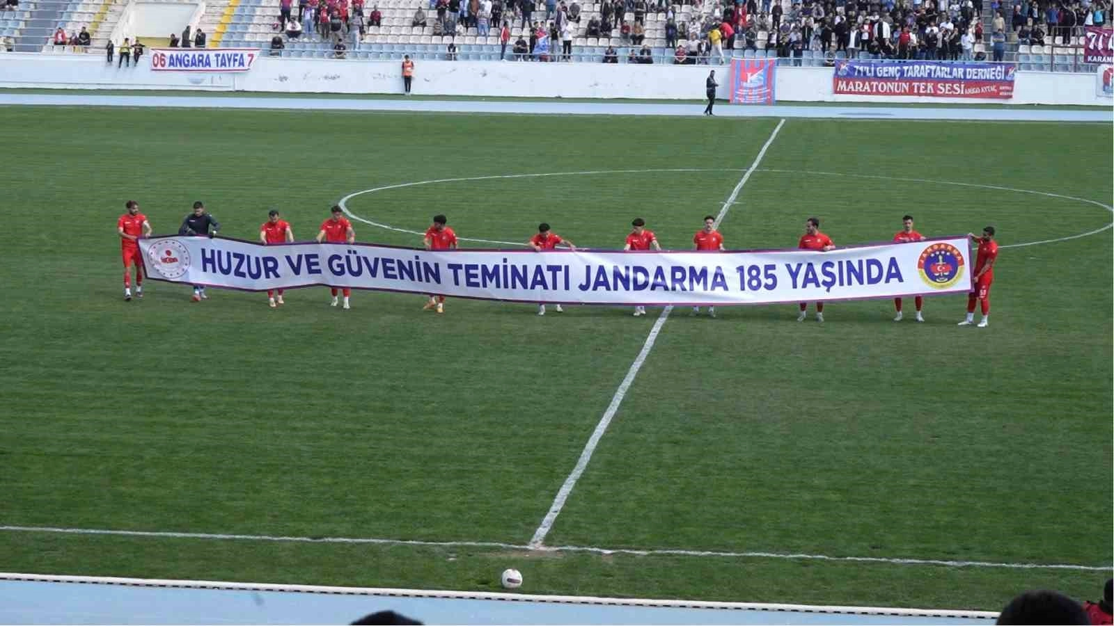 Kırıkkalegücü FSK futbolcuları, karşılaşma öncesi "Huzur ve güvenin teminatı jandarma 185 yaşında" pankartıyla saha çıktı.