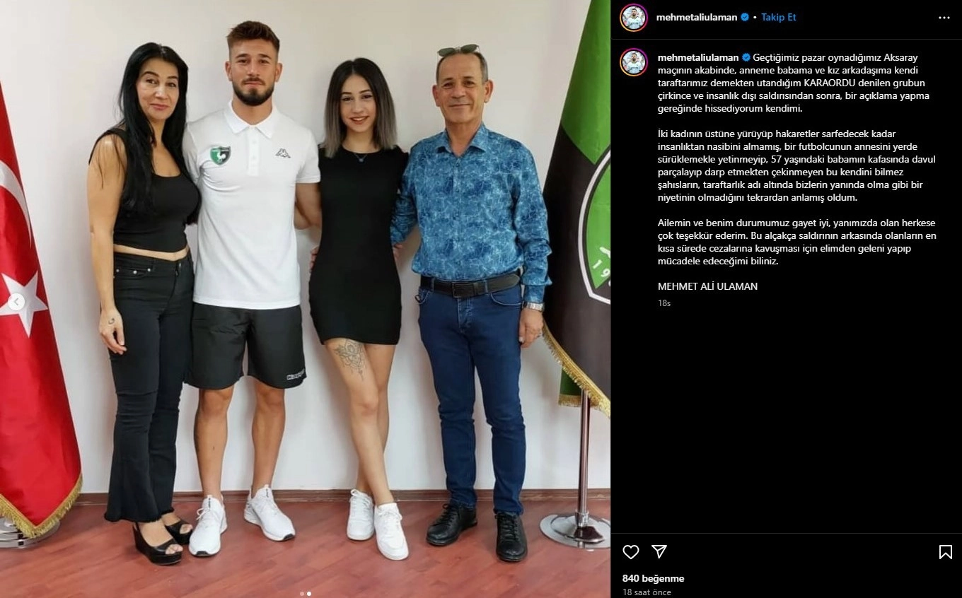 Sosyal medyada paylaşımda bulunan Denizlispor oyuncusu Mehmet Ali Ulaman, "Geçtiğimiz Pazar oynadığımız Aksaray maçının akabinde, anneme babama ve kız arkadaşıma kendi taraftarımız demekten utandığım Karaordu denilen grubun çirkince ve insanlık dışı saldırısından sonra, bir açıklama yapma gereğinde hissediyorum. İki kadının üstüne yürüyüp hakaretler sarf edecek kadar insanlıktan nasibini almamış, bir futbolcunun annesini yerde sürüklemekle yetinmeyip, 57 yaşındaki babamın kafasında davul parçalayıp darp etmekten çekinmeyen, kendini bilmez şahısların, taraftarlık adı altında bizlerin yanında olma gibi bir niyetinin olmadığını tekrardan anlamış oldum. Benim ve ailemin durumu gayet iyi. Yanımızda olan herkese çok teşekkür ederim. Bu alçakça saldırının arkasında olanların en kısa sürede cezalarına kavuşması için elimden geleni yapıp mücadele edeceğimi biliniz" şeklinde açıklamada bulundu.