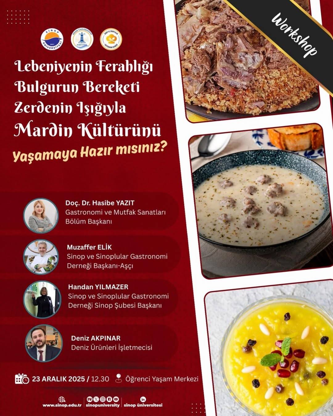 Sinop Üniversitesi tarafından organize edilen etkinlikte, Mardin mutfağının geleneksel tatları yalnızca lezzet yönüyle değil, kültürel ve tarihsel boyutlarıyla da ele alınacak. Workshop kapsamında lebeniye, bulgur ve zerde gibi yöresel lezzetler üzerinden Mardin’in zengin mutfak kültürü tanıtılacak.