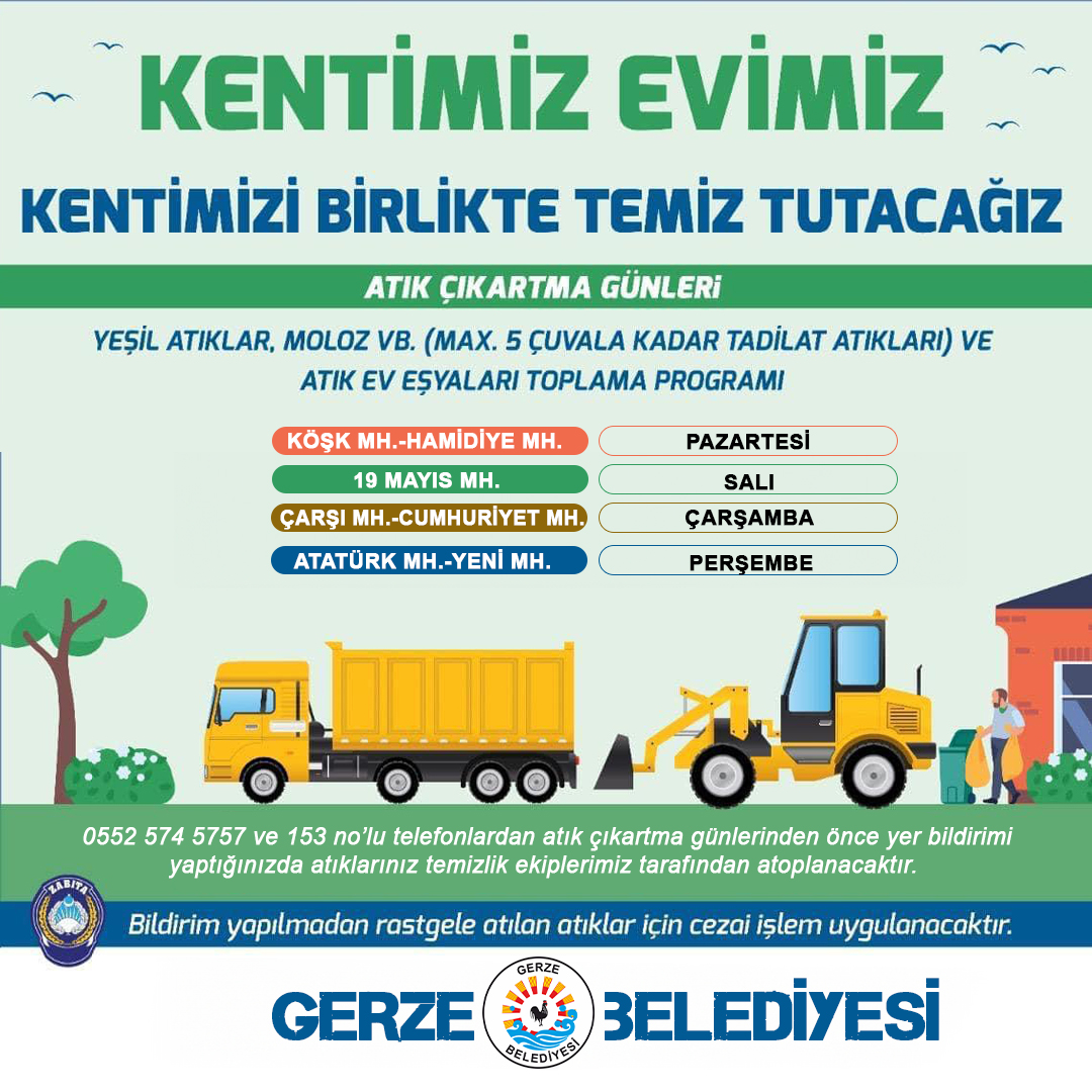 Köşk Mahallesi ve Hamidiye Mahallesinde yeşil atıklar, moloz vb. (max. 5 çuvala kadar tadilat atıkları) ve atık ev eşyaları Pazartesi günü, 19 Mayıs Mahallesinde yeşil atıklar, moloz vb. (max. 5 çuvala kadar tadilat atıkları) ve atık ev eşyaları Salı, Çarşı Mahallesi ve Cumhuriyet Mahallesinde yeşil atıklar, moloz vb. (max. 5 çuvala kadar tadilat atıkları) ve atık ev eşyaları Çarşamba, Atatürk Mahallesi ve Yeni Mahallede yeşil atıklar, moloz vb. (max. 5 çuvala kadar tadilat atıkları) ve atık ev eşyaları Perşembe günü toplanacak.