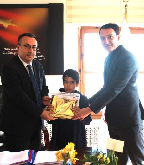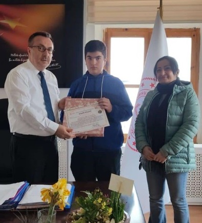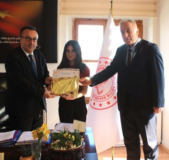 Sıfır Atık Yarışmalarında İl Birincisi olan Eymen Çor, İnci Demirci ve Görkem Poyraz Özsomuncu için İlçe Milli Eğitim Müdürü Yılmaz Ceylan tarafından ödül töreni düzenlendi.