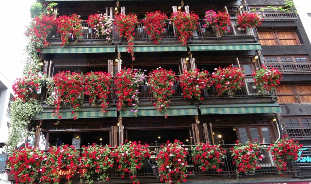 Giresun'un en işlek caddelerinden Gazi Caddesi'nde bulunan ve balkonları rengarenk çiçeklerle kaplı bina görenleri ilgisini çekerken, bina beton yığınları arasında adeta bir sanat eseri gibi duruyor.