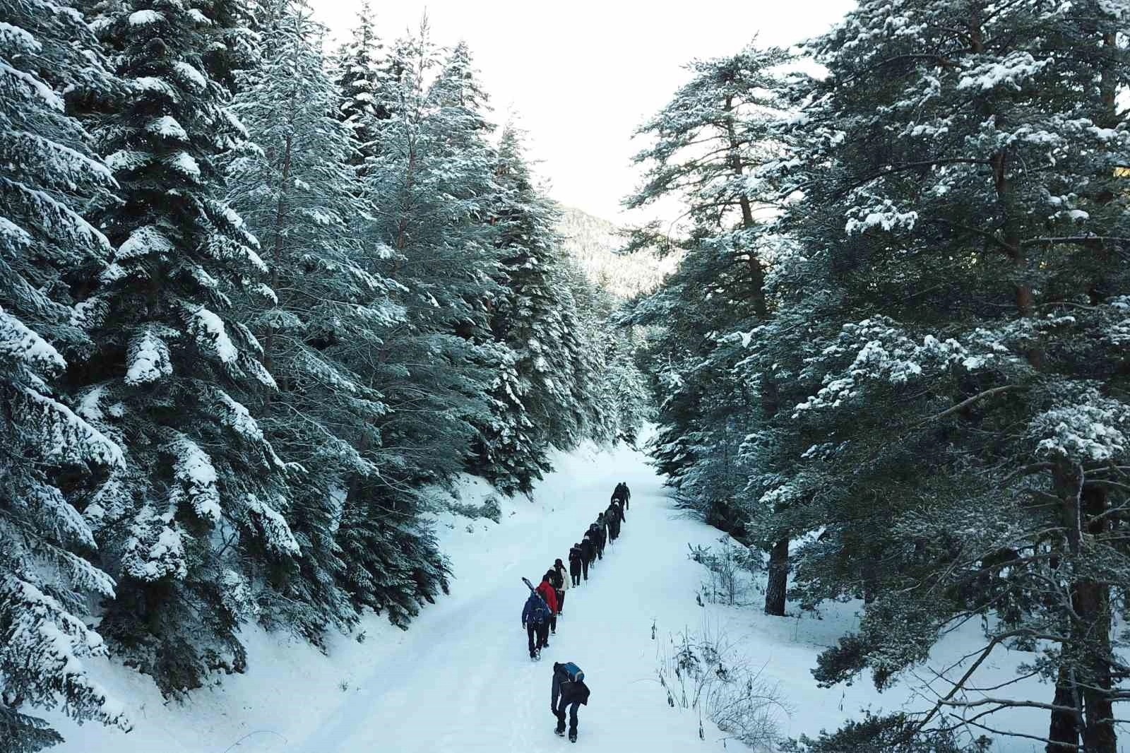 Yaklaşık 6 kilogramlık kayak takımını omuzunda taşıyarak yaylaya ulaşan Burak Soydaş, "Bugünkü yürüyüşümüzde 2 bin metrenin üzerine kadar çıktık. Güzel bir kış yürüyüşü oldu. Yol boyunca yer yer 70 santimetreye ulaşan kar kalınlığı yaylada bir metreyi geçti. Kar olacağını bildiğim için ilk defa kayak takımımı da yanımda getirdim. Omuzumda taşıdığım kayaklarımla ulaştığım yayladan sonra güzel bir iniş yaptım. Manzara çok güzeldi. Ağaçlar kar yağışı nedeniyle beyaza bürünmüştü. Dereler buz tutmuştu. Bunlar çok güzel görüntüler oluşturdu. Hem güzel manzaraları izledik hem spor yaptık hem de kayak zevkini de tatmış olduk" dedi.