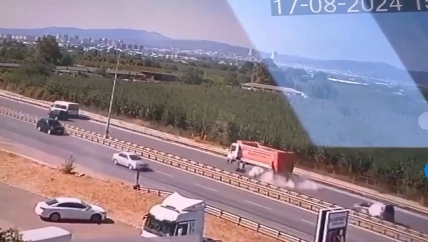Olay, merkez Yıldırım ilçesi 11 Eylül Bulvarı üzerinde meydana geldi. Edinilen bilgiye göre, seyir halinde olan hafriyat kamyonunun lastiği bomba gibi patladı. Facianın eşiğinden dönülen anlar, saniye saniye güvenlik kamerasına yansıdı.