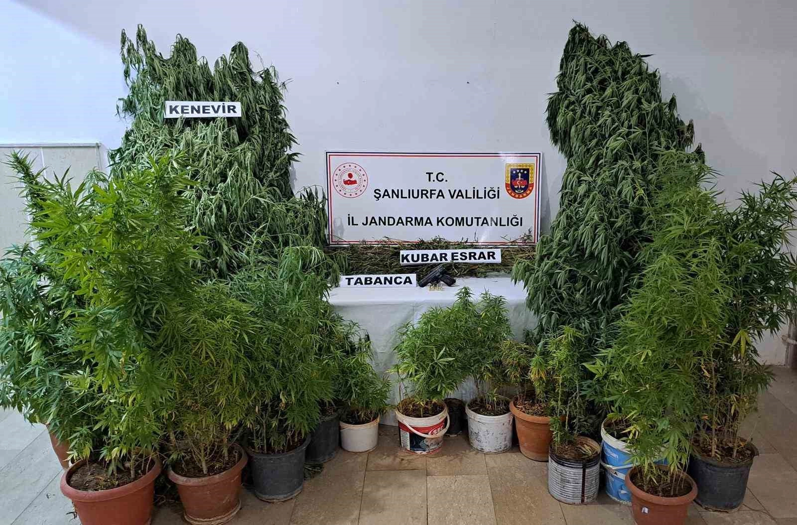 Şanlıurfa'nın Halfeti ilçesinde jandarma tarafından bir adrese düzenlenen operasyonda 262 kök kenevir bitkisi ile ruhsatsız tabanca ele geçirildi.