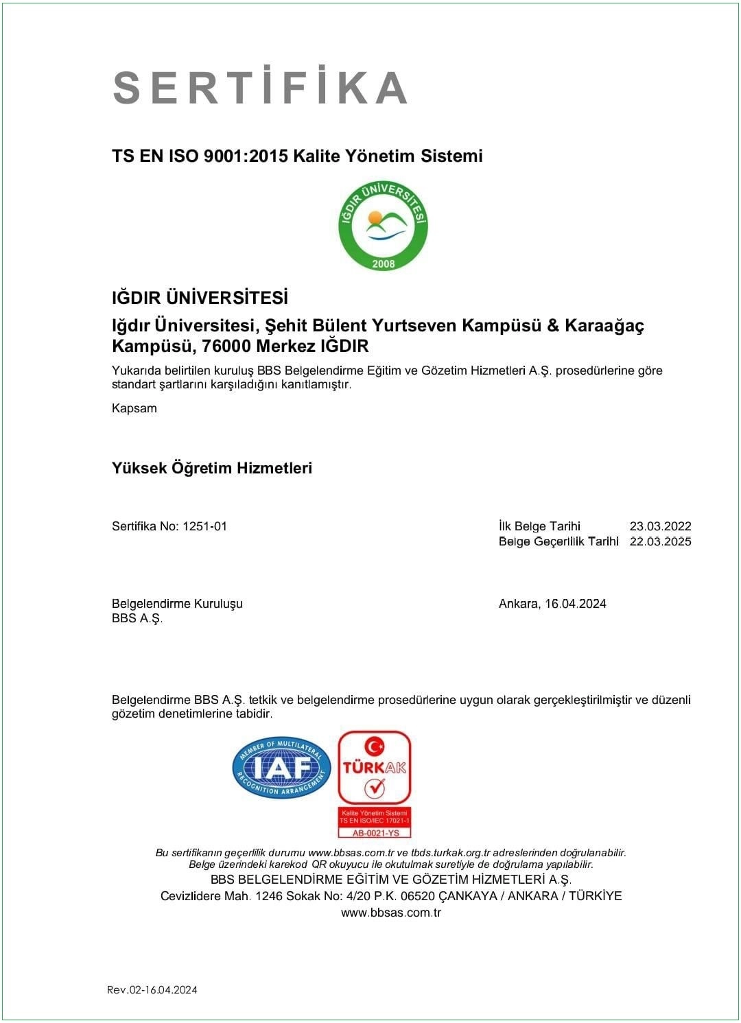 Iğdır Üniversitesinin 2022 yılında almaya hak kazandığı TS EN ISO 9001:2015 Kalite Yönetim Sistemi Belgesi yeniden tescillendi. Konuya ilişkin bir açıklama yapan ve Iğdır Üniversitesi Rektörü Prof. Dr. Mehmet Hakkı Alma, şu ifadeleri kullandı: "TS EN ISO 9001:2015 belgesi sadece üniversitemizin kalite standartlarına uygunluğunu göstermekle kalmayacak, aynı zamanda bize uluslararası düzeyde itibar kazandıracaktır. Üniversitemizin uluslararası standartlara uygun kalite politikaları ve prosedürleri benimsemesinin yanı sıra, daha iyi hizmet sunma ve iş mükemmelliği hedefimize ulaşmamıza da yardımcı olacaktır. Belgelendirme, sadece bir başlangıçtır. Asıl bundan sonra kalite yönetim sistemimizin sürdürülebilirliği için gerekli adımları hep birlikte atmamız gerekmektedir. Önümüzdeki dönemde, kaliteye olan taahhüdümüzü daha da güçlendirecek, sürekli iyileştirmeye odaklanacağız. Bu sayede eğitim ve araştırma faaliyetlerimizde daha üst bir seviyeye ulaşabileceğimize inanıyorum."