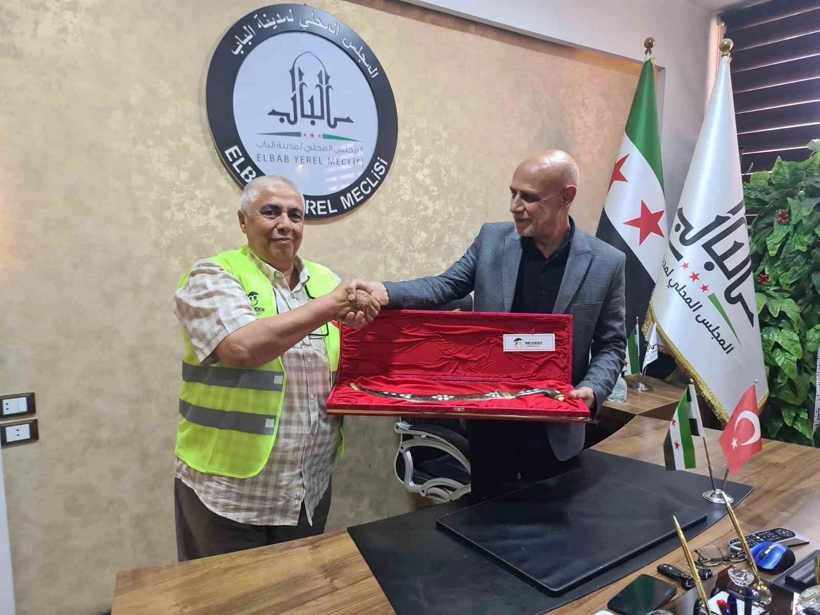 Ziyarette El Bab Meclis Başkanı Adnan Sabbag'a İmkander derneği Başkanı Sait Gökdere tarafından işlemeli kılıç hediye edildi.
