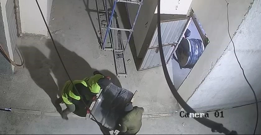 Görüntülerde hırsızların inşaata girip dev kablo rulolarını çaldıkları görülüyor.