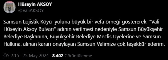 Eskişehir Valisi Hüseyin Aksoy, eski görev yeri olan Samsun'da isminin bir bulvara verilmesiyle ilgili mesaj yayımlayarak, alınan kararda katkısı bulunanlara teşekkür etti.