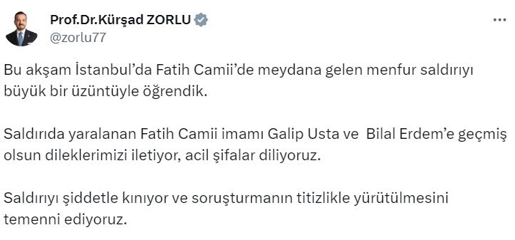 İYİ Parti Sözcüsü Kürşad Zorlu, Fatih Camii'nde imama ve bir vatandaşa yapılan saldırıyı kınayarak, "Fatih Camii imamı Galip Usta ve Bilal Erdem'e geçmiş olsun dileklerimizi iletiyoruz" dedi.
