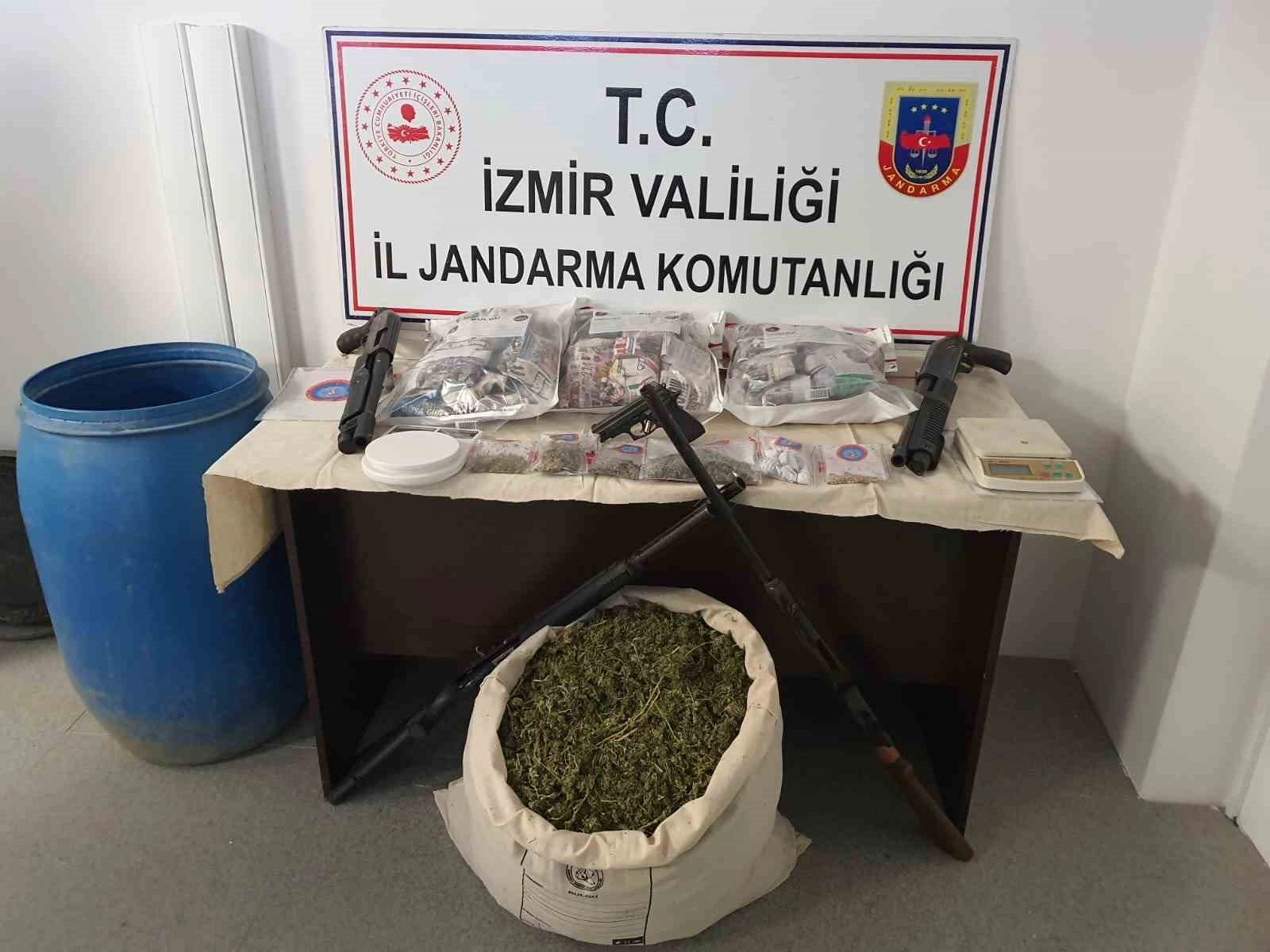 İzmir İl Jandarma Komutanlığına bağlı Kaçakçılık ve Organize Suçlarla Mücadele (KOM) ve Menderes İlçe Jandarma Komutanlığı ekipleri, Menderes ilçesinde bir evde uyuşturucu madde ticareti yaptığı belirlenen şüphelileri tespit etti. Menderes Cumhuriyet Başsavcılığı koordinesinde adrese operasyon gerçekleştiren ekipler, evde kubar esrar, kenevir tohumu, 2 hassas terazi ile 4 ruhsatsız av tüfeği ve 1 kuru sıkı tabanca ele geçirdi.