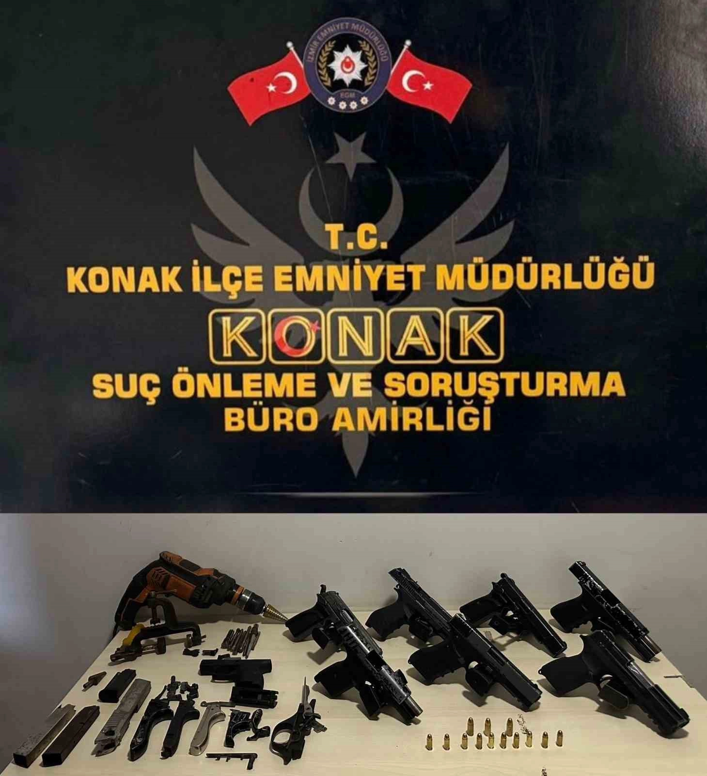 Konak İlçe Emniyet Müdürlüğü Suç Önleme ve Soruşturma Büro Amirliği ekipleri, Kuruçay semtinde bulunan bir adreste silah imalatı yapıldığı bilgisi üzerine harekete geçti. Savcılıktan alınan izinle adrese operasyon gerçekleştiren ekipler, 7 ruhsatsız tabanca, çok sayıda silah parçası ve silah yapımında kullanılan malzemeler ele geçirdi.