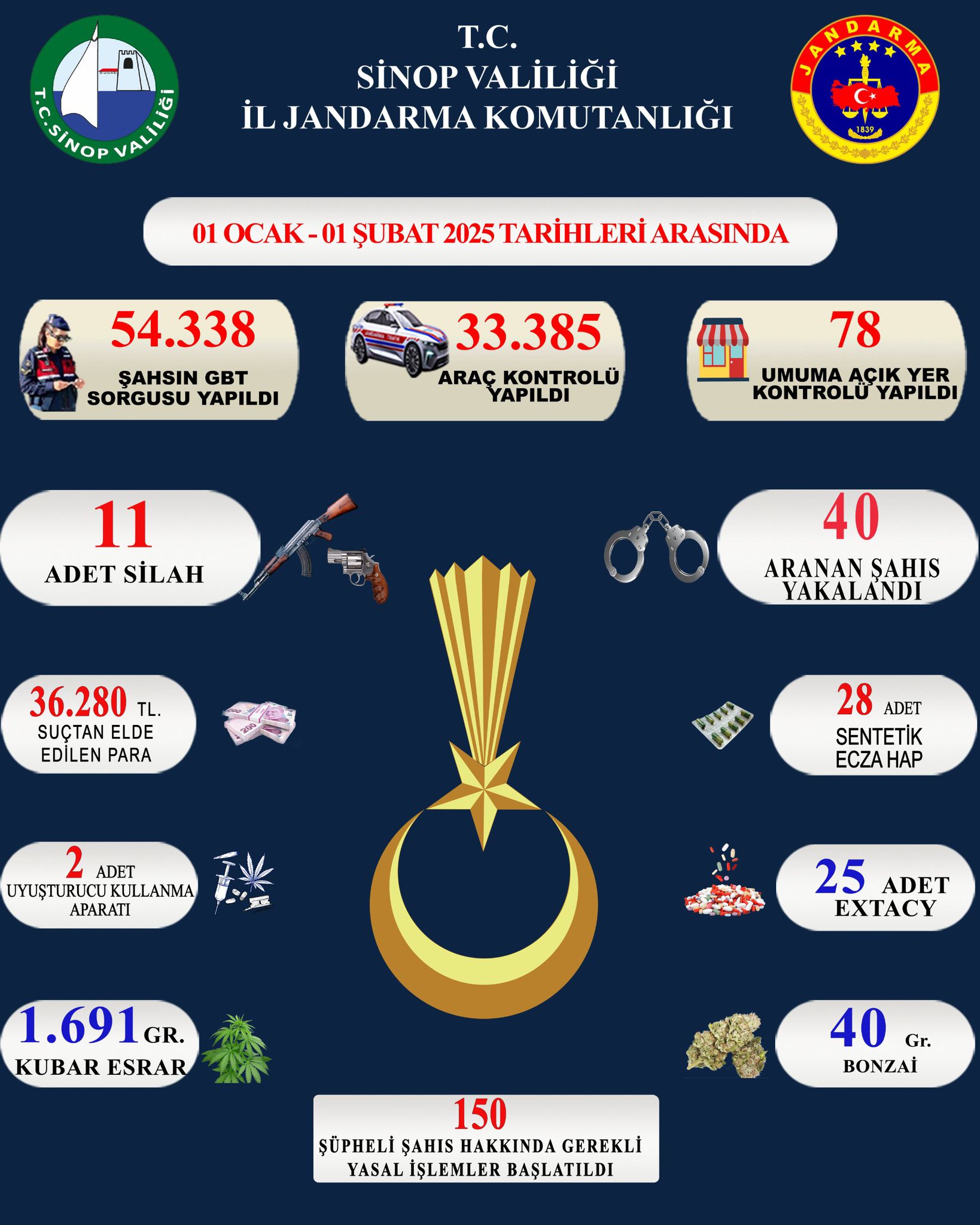 Sinop Valiliği tarafından paylaşılan raporda, İl Jandarma Komutanlığı tarafından 01 Ocak-01 Şubat tarihleri arasında yapılan denetimlerde, 54.338 Şahıs, 33.385 Araç, 78 Umuma Açık İş yeri kontrol edildi. Yapılan çalışmalar neticesinde, 40 Aranan Şahıs, 1.691 Gr Kubar Esrar, 45 Gr Bonzai, 25 Adet Extacy,28 Adet Sentetik Ecza Hap, 2 Adet Uyuşturucu Kullanma Aparatı, 36.280 TL Suçtan Elde Edilen Para, 11 Adet Silah yakalandı. Toplam 150 şüpheli şahıs hakkında gerekli yasal işlemler başlatıldı.