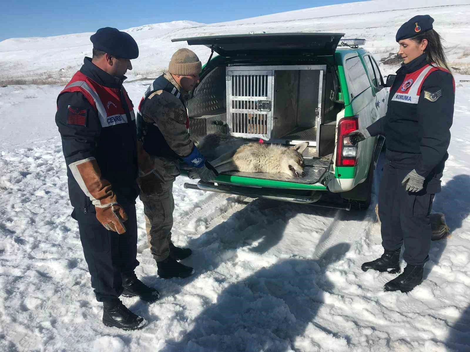 Erzurum'da Jandarma ekiplerince yaralı olarak bulunan kurt, Doğa Koruma ve Milli Parklar Müdürlüğüne teslim edildi.