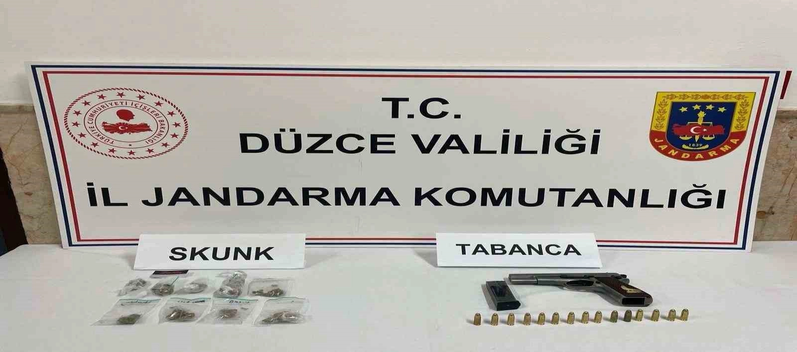 Düzce Valiliğinden yapılan açıklamada İl Jandarma Komutanlığına bağlı Kaçakçılık ve Organize Suçlarla Mücadele Müdürlüğü ekipleri ve Kaynaşlı İlçe Jandarma Komutanlığı ekipleri ile birlikte yapılan yol emniyet ve kontrol faaliyetinde uyuşturucu madde sevkiyatı yaptığı tespit edilen şüpheli 2 şahıs ve silah sevkiyatı yaptığı tespit edilen, 1 şahıs yapılan operasyon neticesinde yakalandı. Yakalanan şahısların üzerlerinde yapılan aramalarda; 20 gram shunk maddesi, 6 gram kubar esrar maddesi, 1 adet 9 mm. çapında tabanca, şarjör ve 15 adet fişek ele geçirildi.