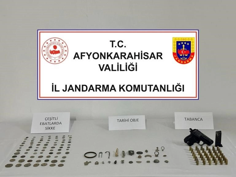 Afyonkarahisar'da jandarma tarafından bir eve yapılan baskında 25 tarihi obje ile birlikte 78 adet tarihi sikke ele geçirilirken, olayla ilgili 3 kişi gözaltına alındı.