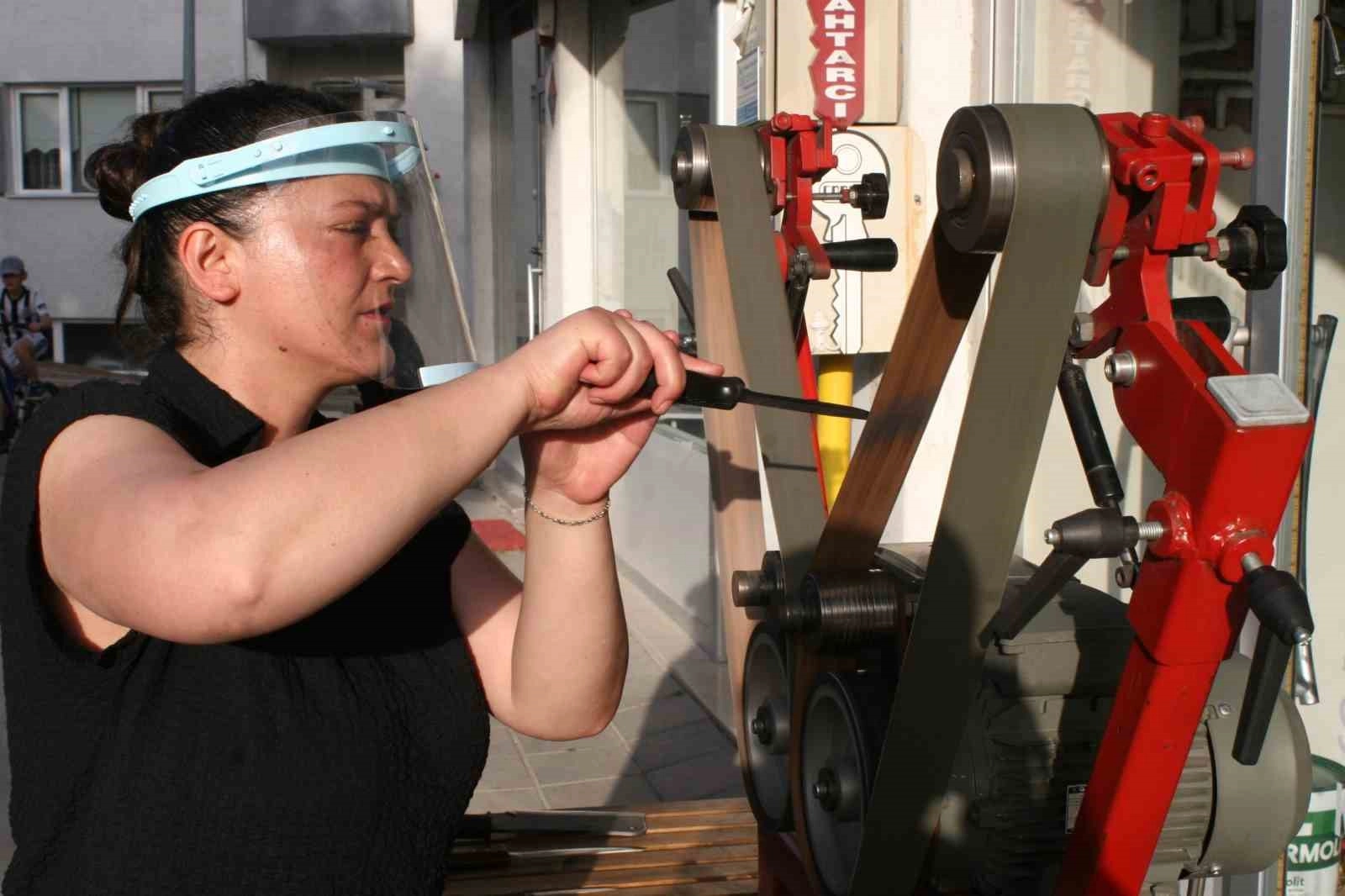 Bilecik'in Bozüyük ilçesinde bıçak bileme işi yapan Meltem Çelik'i görenler şaşkınlık yaşarken Çelik işini en iyi şekilde yapıyor. Yaklaşık 7 yıl önce çilingir ve anahtar çoğaltma dükkanı açtıklarını ve müşterilerinin talepleri doğrultusunda bıçak bileme işine başladığını anlatan Meltem Çelik, "Müşterilerimizden gelen istek üzerine bıçak bileme makinesini temin ettik. Özellikle Kurban Bayramı öncesi çok yoğun çalışmaktayız. Gece geç saatlere kadar buradayız. Müşterilerimize hizmet etmekteyiz. Bıçak bileme makinemizde sonsuz zımpara var. Müşterilerimizden gelen kör bıçakları, önce ağzını düzeltiyoruz, sonra bileme makinesinde biliyoruz. En son bıçaklarımız da kalan çapakları kılağ makinesinde alıyoruz ve bıçaklarımızı keskin hale getiriyoruz" dedi.
