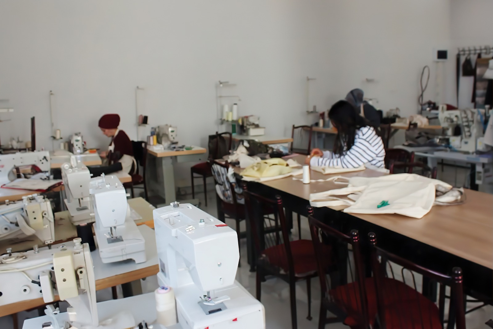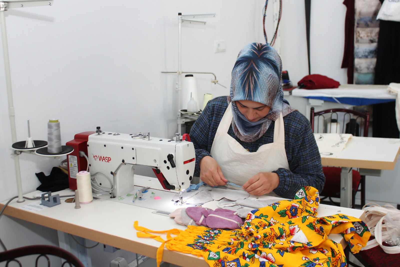 Tekstil bölümünde ilk olarak bir aylık süreçte 15 gün boyunca ilçedeki kadınlara eğitim veriyoruz. Burada makinelerin kullanımıyla ilgili temel bilgiler verildikten sonra onları üretime dâhil ediyoruz. Yani bir şekilde istihdam etmiş oluyoruz.