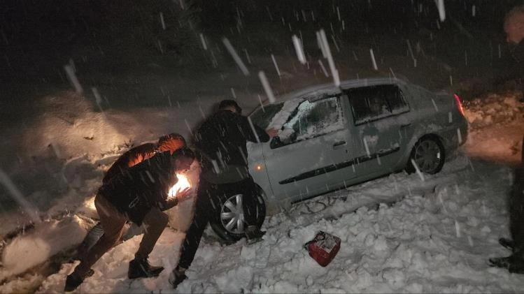 Karabük'te yüksek kesimlerde etkili olan kar yağışı nedeniyle birçok araç yolda kalırken, yol kenarındaki kanala düşen otomobili polis, jandarma ve vatandaşlar kurtardı.
