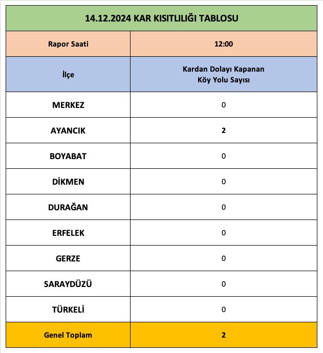 Sinop Valiliğinden yapılan açıklamada, Sinop’un Ayancık ilçesine bağlı 2 köy yolunun yoğun kar yağışı nedeniyle ulaşıma kapandığı bildirildi. Yolların açılması Özel İdare ekipleri tarafından yol açma ve kar küreme çalışmalarının aralıksız devam ettiği ifade edildi.